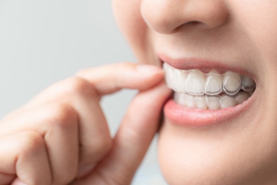 透明に近いマウスピース型の装置です。歯に矯正装置をつけていることを周りにほとんど気付かれることなく歯並びの矯正治療を行うことができます。
